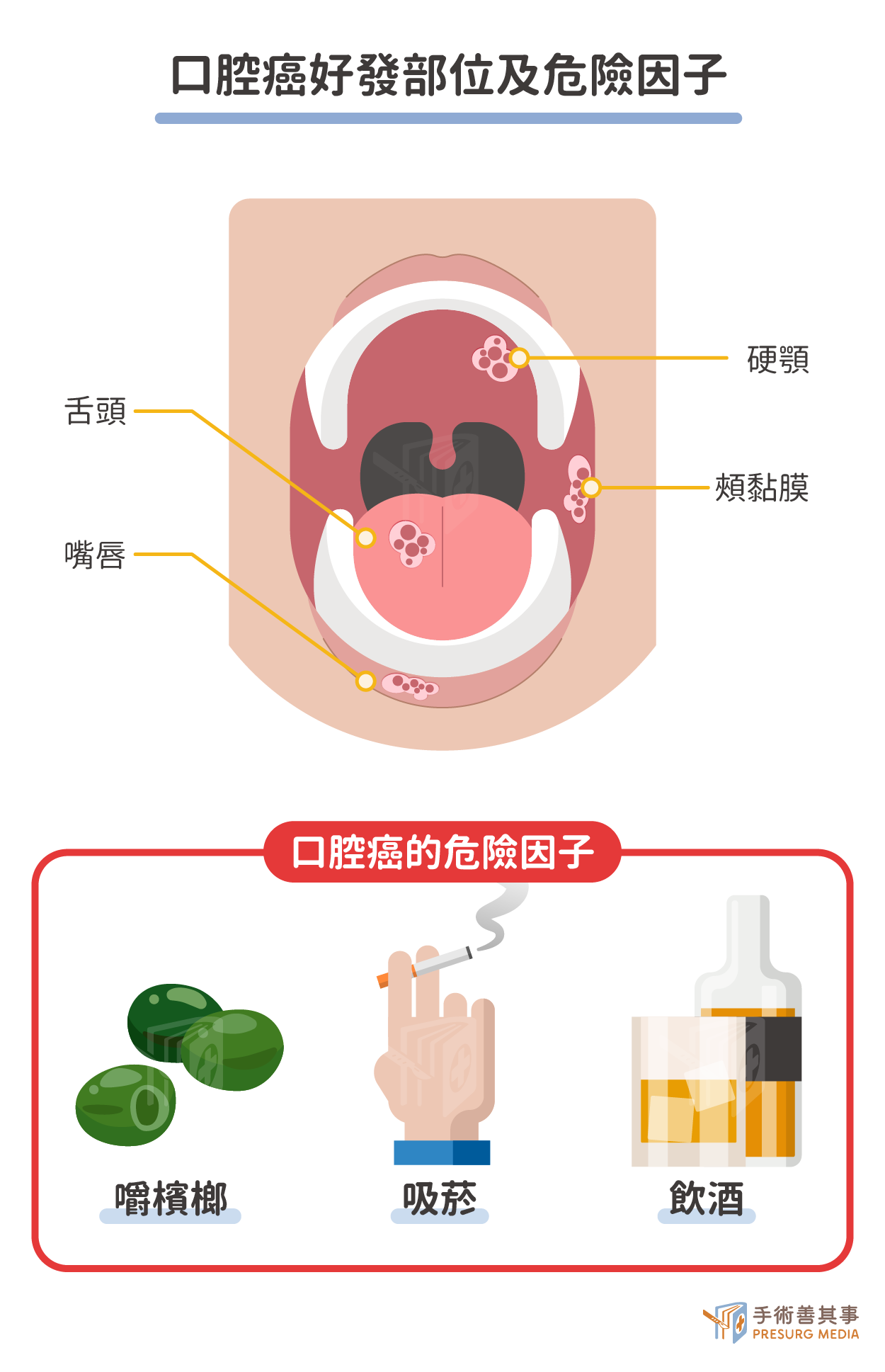 - 吸菸:吸菸會產生7000多種化學物質,其中至少有70種是致癌物,因此吸菸也是口腔癌的重要危險因子。