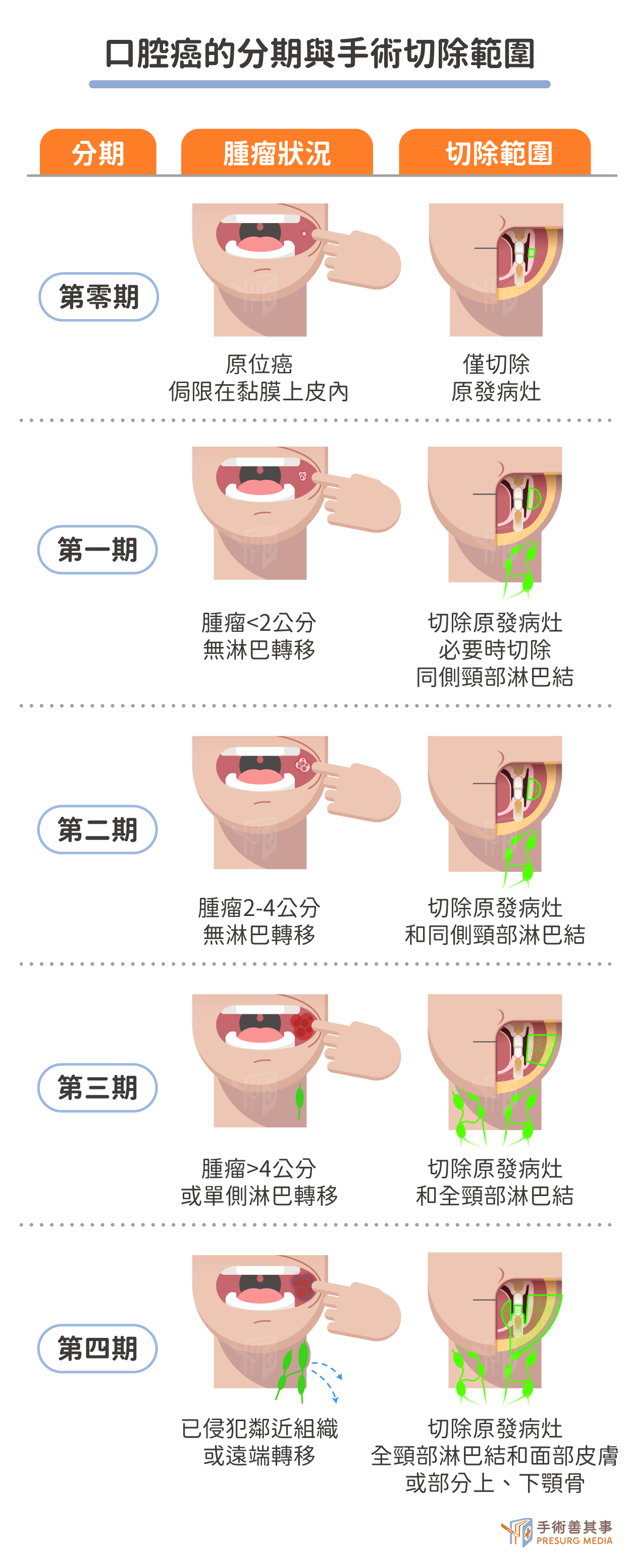 手術切除是治療口腔癌的主要手段。手術的目標是徹底清除腫瘤,同時保留患者的正常功能和外觀,而手術範圍取決於口腔癌的期別和侵犯範圍:| 分期 | 腫瘤特性/轉移情況 | 手術範圍 |