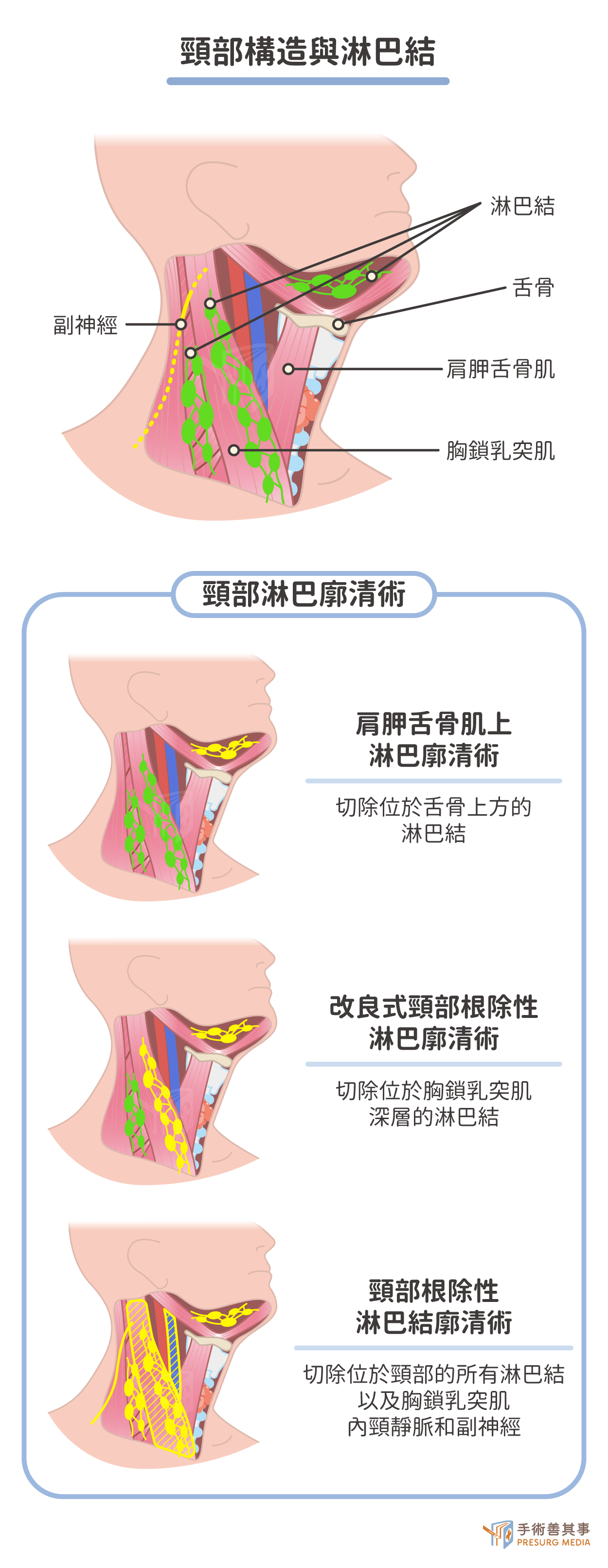 頸部淋巴廓清術目的是切除可能含有癌細胞的淋巴結。淋巴結是免疫系統的一部分,它們可以幫助過濾體液並捕獲癌細胞。頸部淋巴廓清術有以下幾種方式:- 肩胛舌骨肌上淋巴廓清術