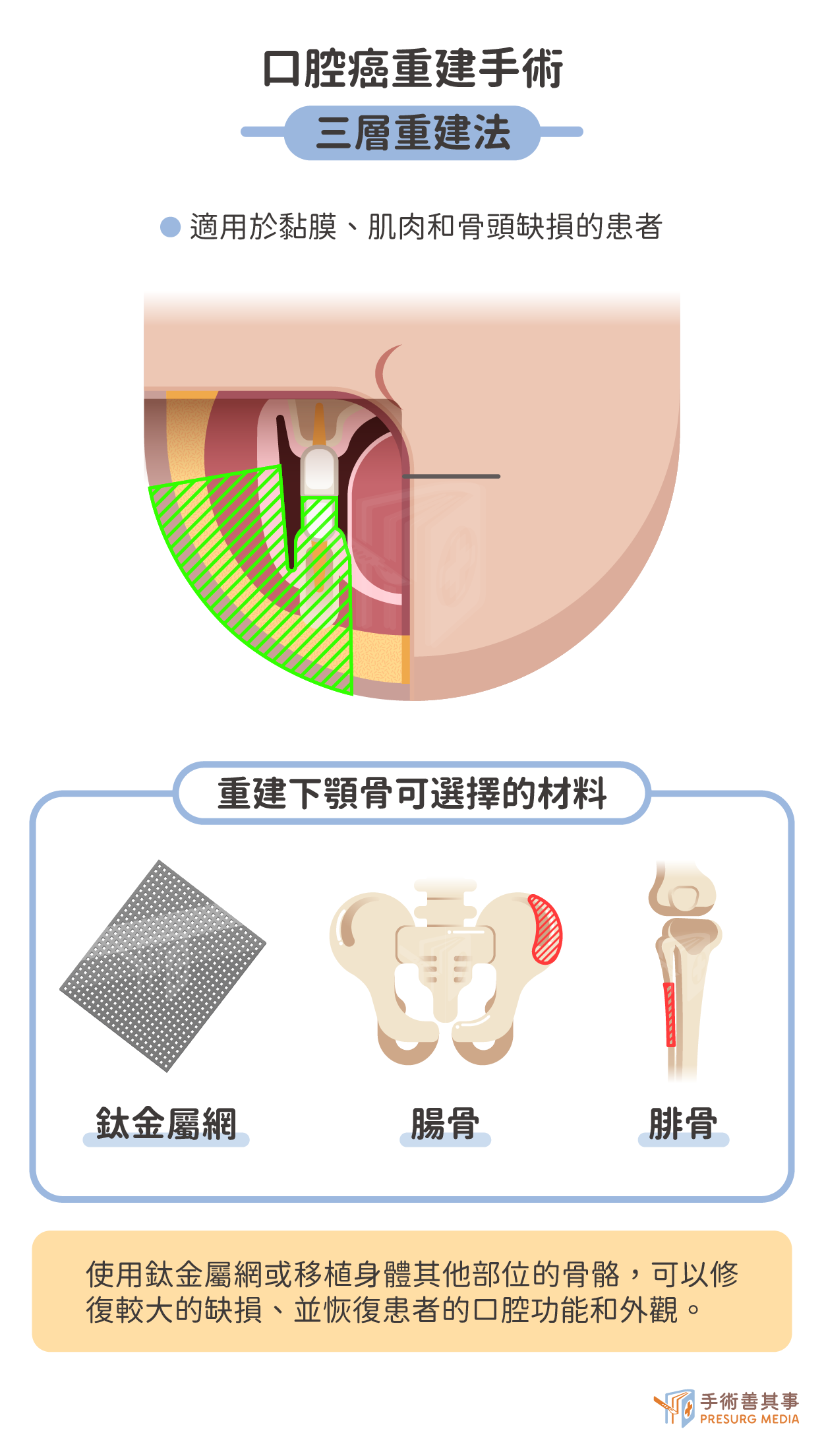 三層重建法:適用於口腔黏膜、肌肉和骨骼缺損的患者