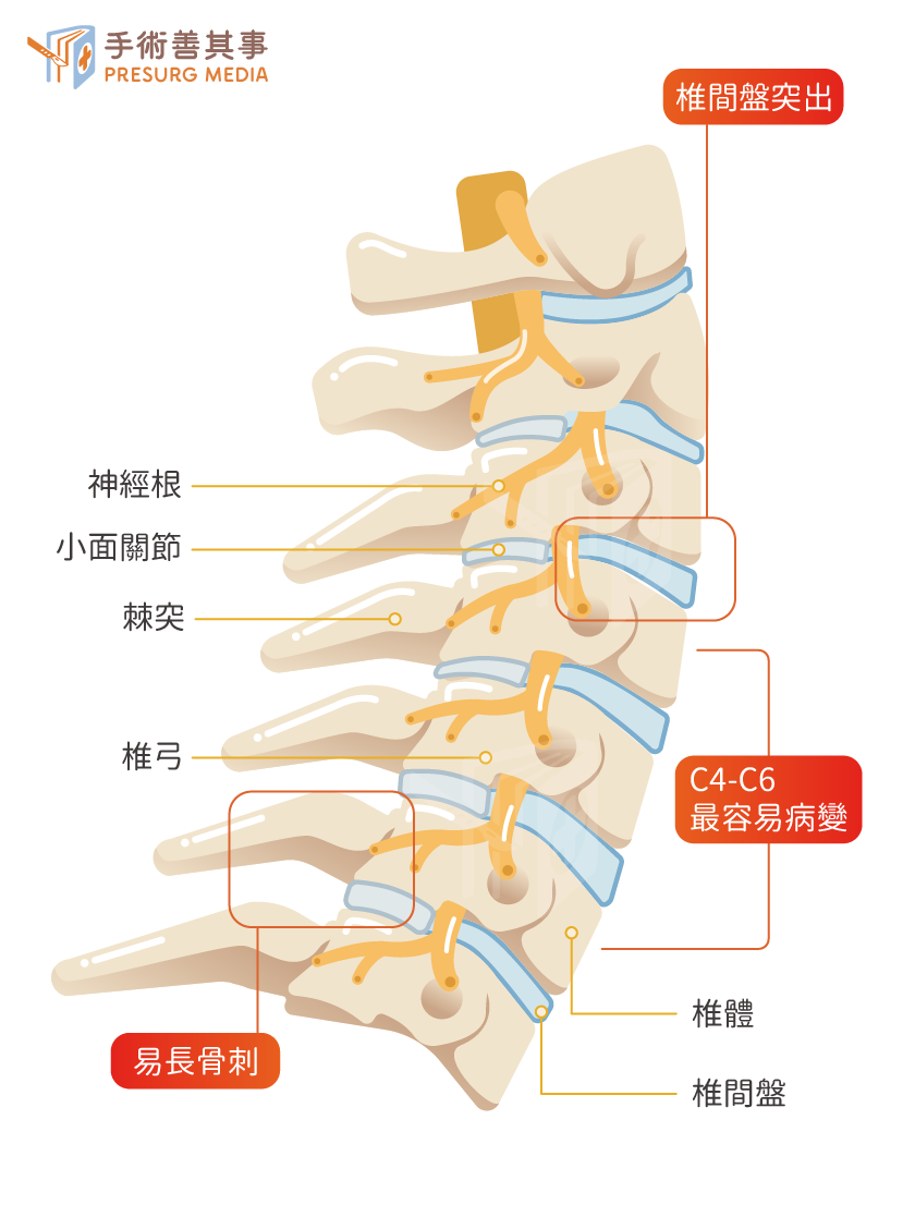- 會壓迫頸神經根,導致手臂麻木或疼痛。