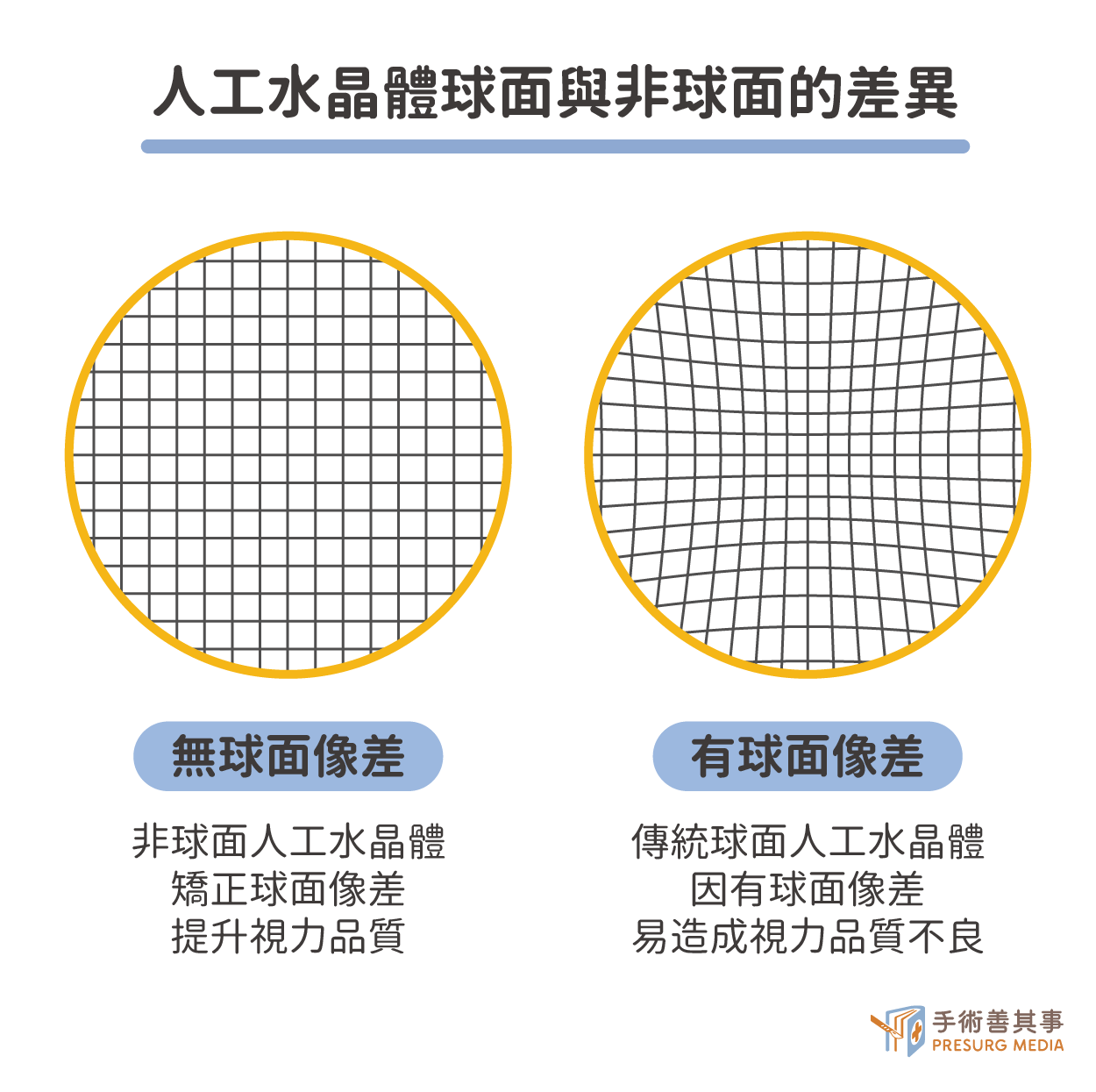 但要注意人工水晶體會和眼球組織漸漸緊密結合,必須審慎選擇,建議一輩子只換一次。目前市面上可選擇的的人工水晶體包含健保和自費,最大差異在健保片是單一焦點的「球面設計」,自費片是「非球面設計」,除了成像有球面扭曲問題,價錢也差很大,我們整理出以下幾種供讀者比較: