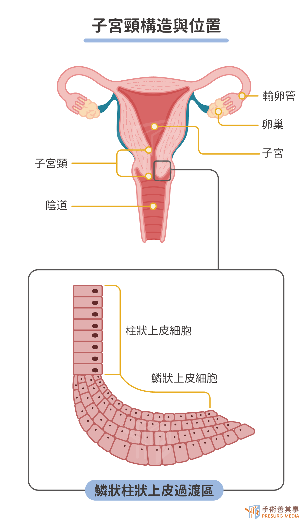 子宮位於膀胱和直腸中間,是人類生兒育女的重要器官,子宮頸則位於子宮下半部,與陰道相接,是陰道微生物及空氣進入子宮的屏障。子宮頸可以分為內頸部與外頸部: