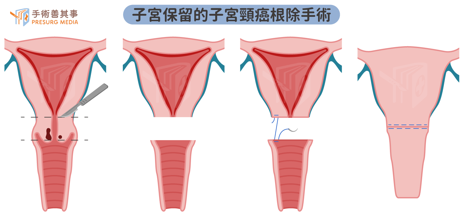根除性的子宮切除術,因為要切除全子宮、子宮頸旁組織、陰道上方及鄰近骨盆的淋巴腺,範圍很廣也包含深層組織,交纏複雜的神經及血管,因此術後併發症也多,一般都是以傳統開腹方式進行。目前文獻上也建議小於兩公分僅侷限於子宮頸的腫瘤比較適合用腹腔鏡,特點為出血少、恢復快、住院天數短,風險為切除範圍有限,需要追加術後輔助性治療,至於療效是否能與開腹手術相當,還沒有太多數據佐證。