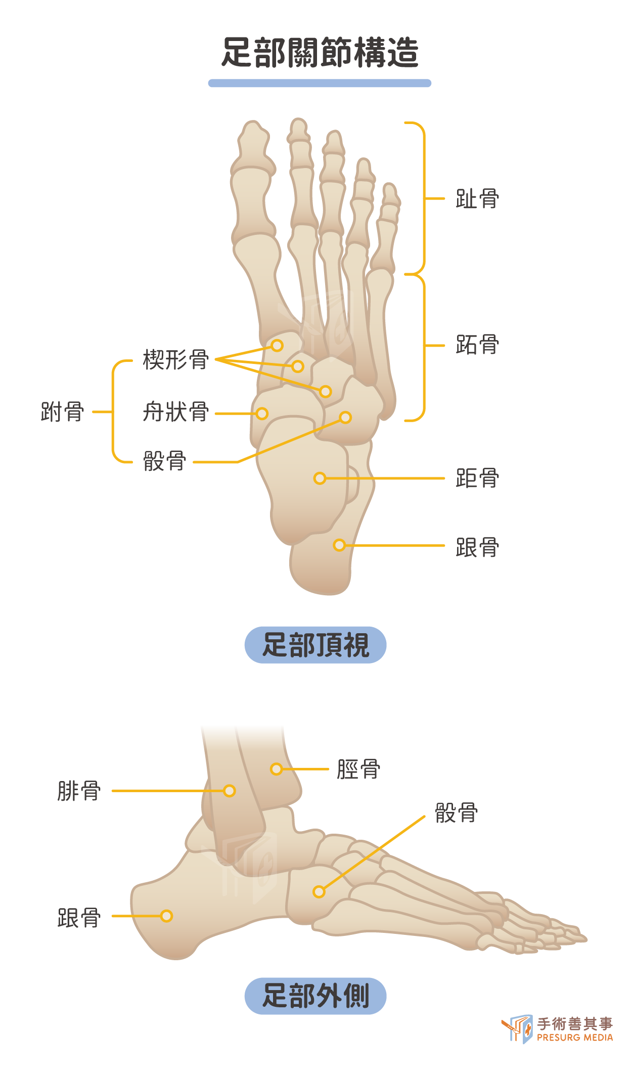 - 跗骨:腳踝和足弓的主要支撐結構。包括:楔形骨三塊、舟狀骨一塊、骰骨一塊。