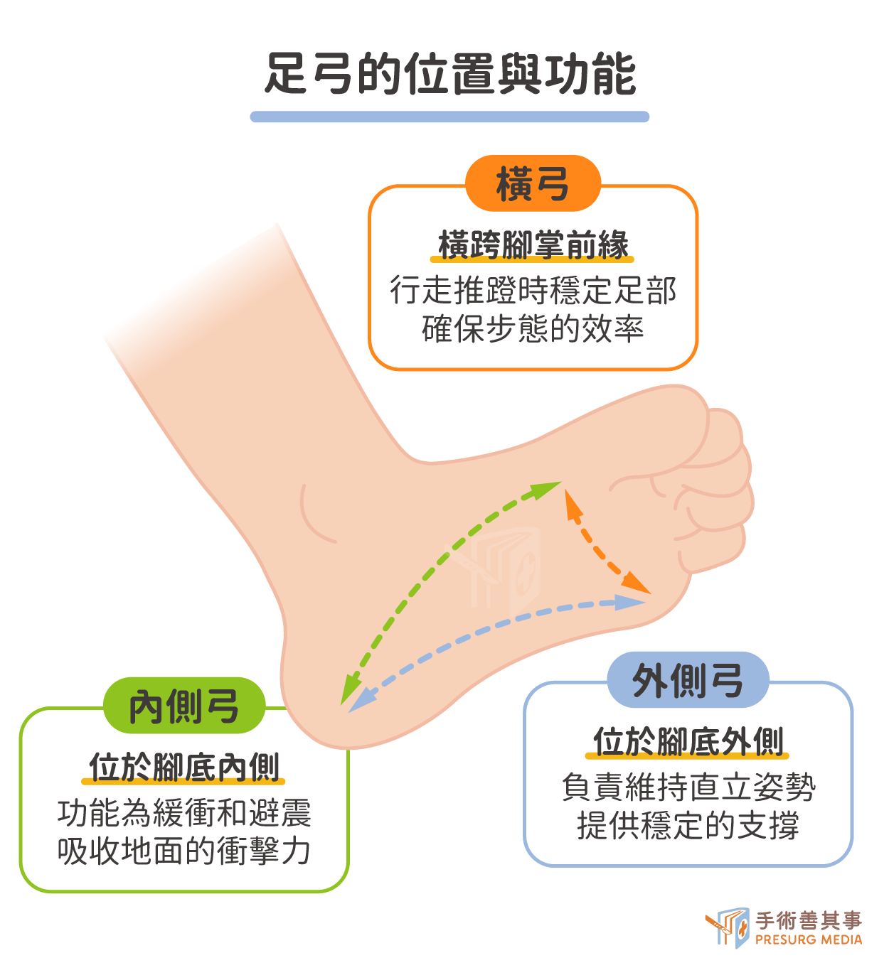 - 橫弓:橫跨腳掌前緣。它的功能是在行走推蹬時穩定足部,確保步態的效率。