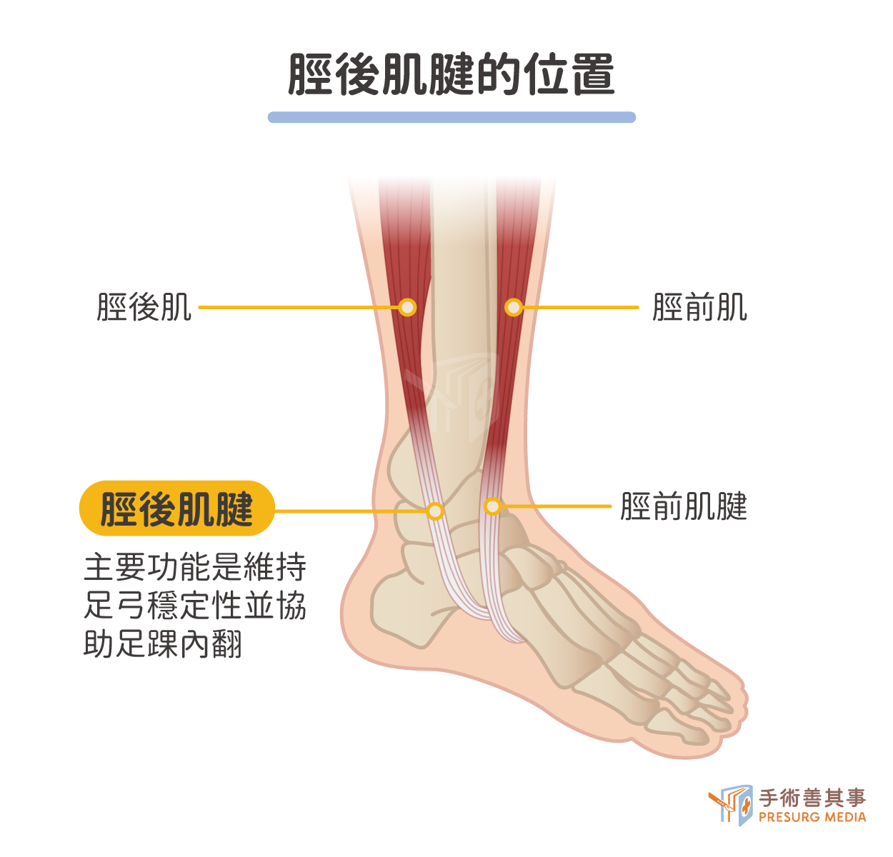 - 脛後肌腱功能失調: 脛後肌腱是維持內側足弓最重要的「弓弦」。它起於小腿後側,繞過腳踝內側(內踝),並附著於足部的舟狀骨、楔狀骨和蹠骨上,主要功能是維持足弓穩定性並協助足踝內翻。雖然主要影響成人,但在青少年或極少數兒童中,若脛後肌腱因發炎、受傷或退化而功能受損,也會直接導致足弓塌陷,形成後天性扁平足。