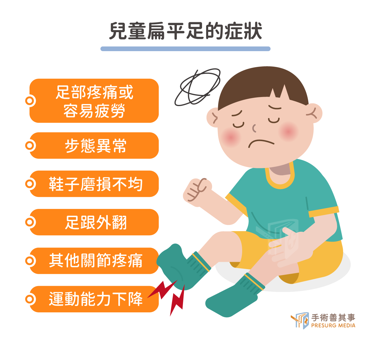 如果兒童扁平足伴隨症狀,常見的臨床表現可能包括以下幾點: