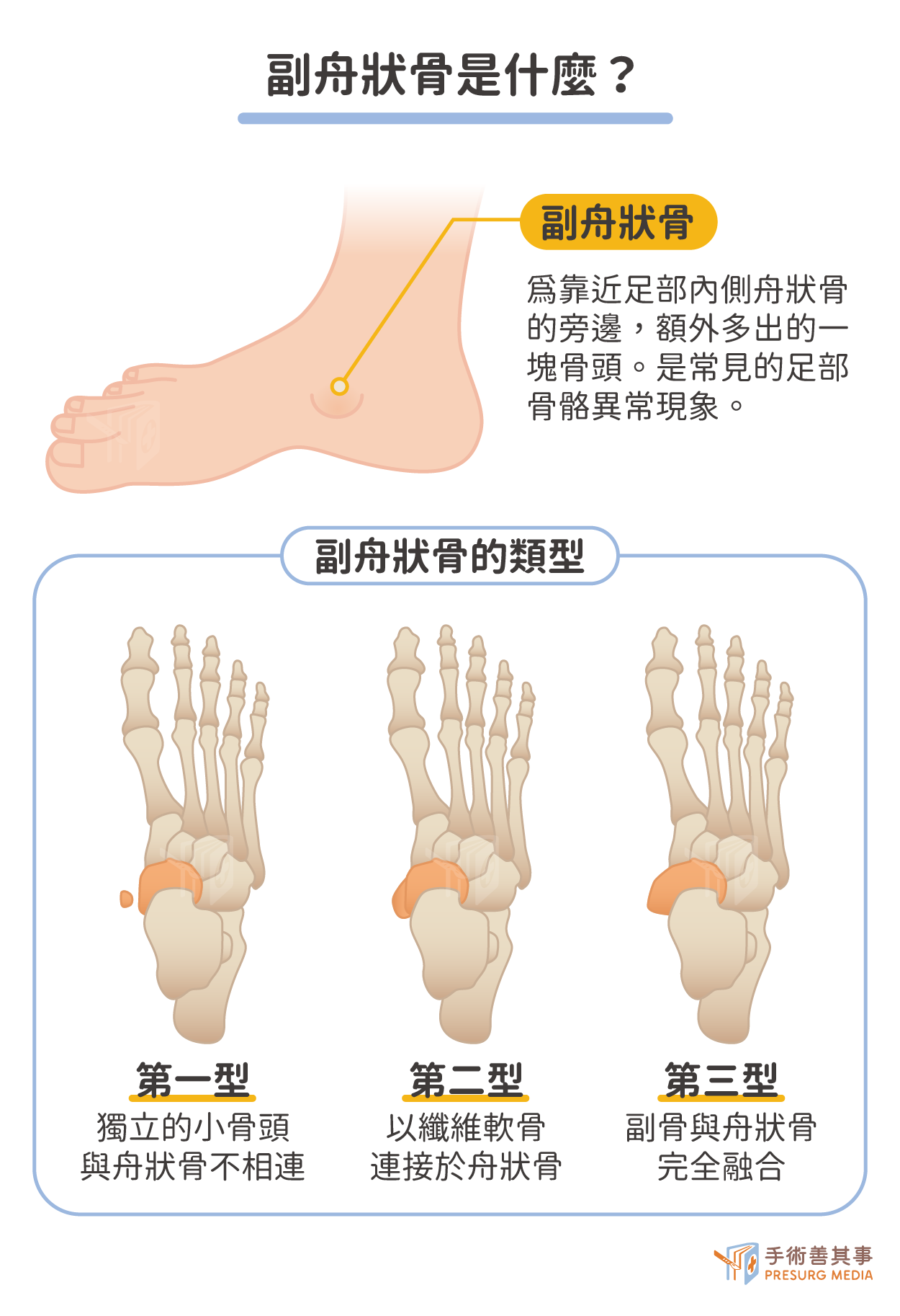 正常情況下,人類的足部有26塊骨頭,但有些人會額外多出骨頭。足部靠近內踝處的骨頭稱為舟狀骨,約10-15%的人在旁邊會多出一塊骨頭,而這塊多的就叫做副舟狀骨(Accessory Navicular Bone),是一種常見的足部骨骼異常。