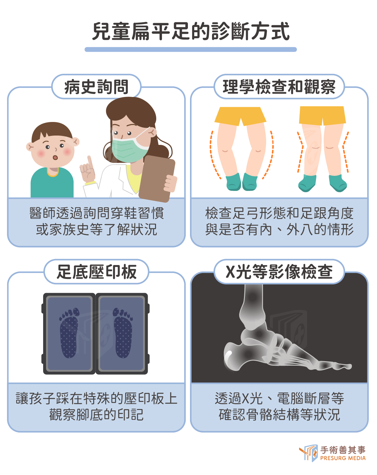 - 理學檢查:觀察非承重(坐著或躺著)、承重時(站立及行走)的足弓形態和足跟角度。並透過觸診評估足部關節的活動度和肌肉力量。重要的檢查是讓孩子踮腳尖,如果踮腳尖時足弓能正常出現,通常是功能性扁平足;如果足弓仍平坦,則可能是僵硬性或病理性扁平足。
