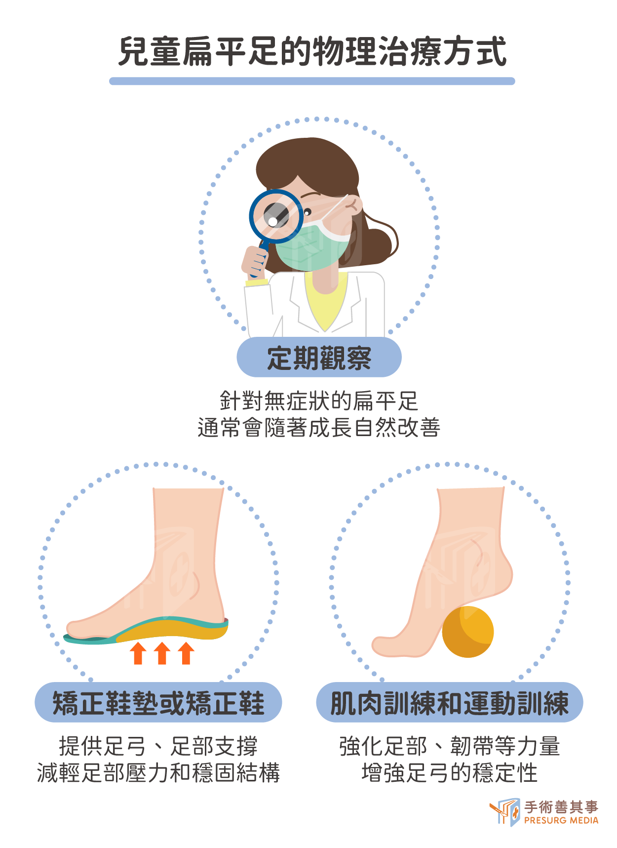 對於兒童扁平足,特別是成長發育中的孩子,保守治療是首要且主要的處理方式。目標在於減輕症狀、改善足部功能,並促進足弓的正常發育。治療方法包括觀察、使用足弓墊、以及肌肉和運動訓練。- 觀察等待: 針對無症狀的扁平足,特別是嬰幼兒及學齡前兒童,通常會隨著成長自然改善,採定期觀察即可。