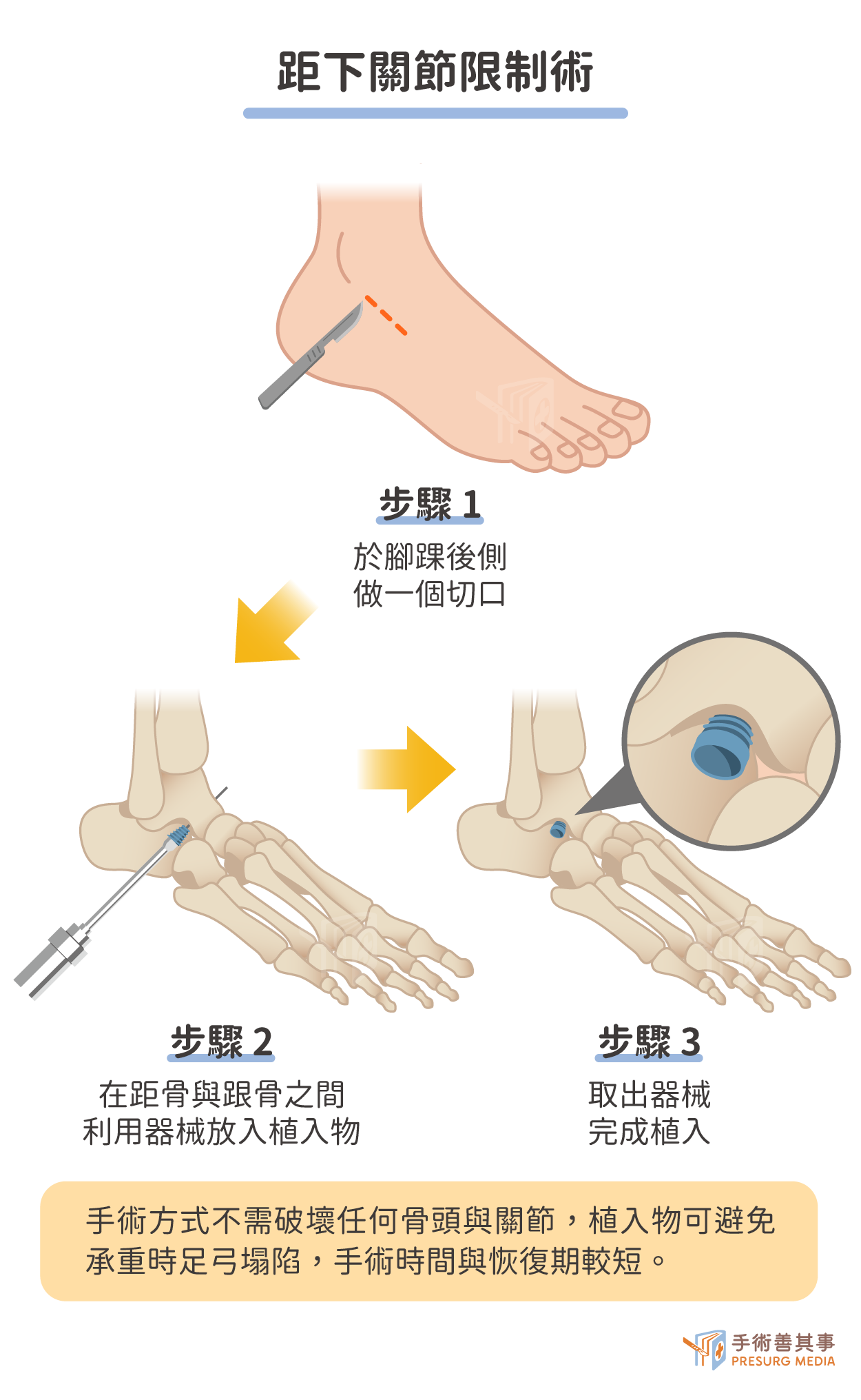在足部開1公分的小傷口,在距下關節(距骨和跟骨之間的關節)中植入一個小型支架來限制過度的關節活動,從而穩定足弓,改善足部的結構和功能,這個固定器就像一個支架,支撐著塌陷的足弓,使其恢復正常的生理曲線。這種手術方式不需破壞任何骨頭與關節,單純用植入物放置在距下關節來避免承重時足弓塌陷,手術時間相對短、復原較快。尤其對年紀較小、青春期前的兒童來說,因為其有較好的適應性與可塑性,所以很少會產生異物感,因此有很好的預後。- 特點:可以有效改善足弓的穩定性,減少疼痛和疲勞。手術時間與恢復期較短。