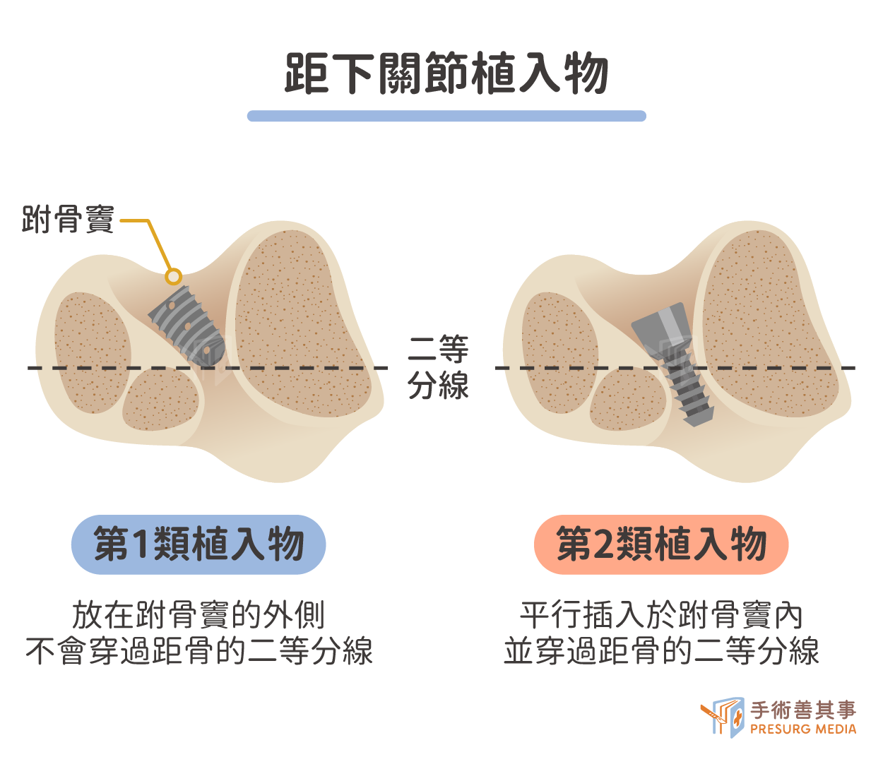 距下關節限制術植入物可稱為距骨下人工墊片,通常由鈦合金或其他耐用材料製成,用於置入距下關節,以限制距骨的前移與內收,並避免跟骨的外翻,根據設計和放置方式的不同,可分為舊型和新型。- 舊型:主要依靠植入物與上下骨頭的直接接觸來產生限制作用。較為容易卡壓骨頭或鬆脫。