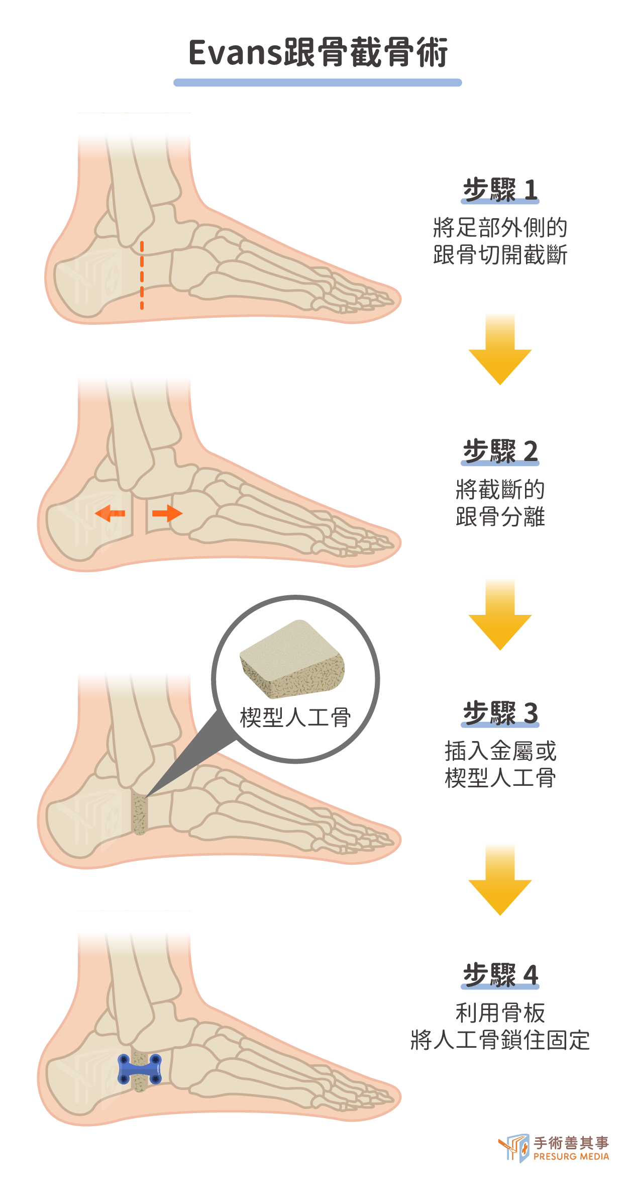 - Evans 跟骨截骨術:這是一種有效的手術,可同時提供三個面向 ( 橫斷面、冠狀面、矢狀面 ) 的矯正。