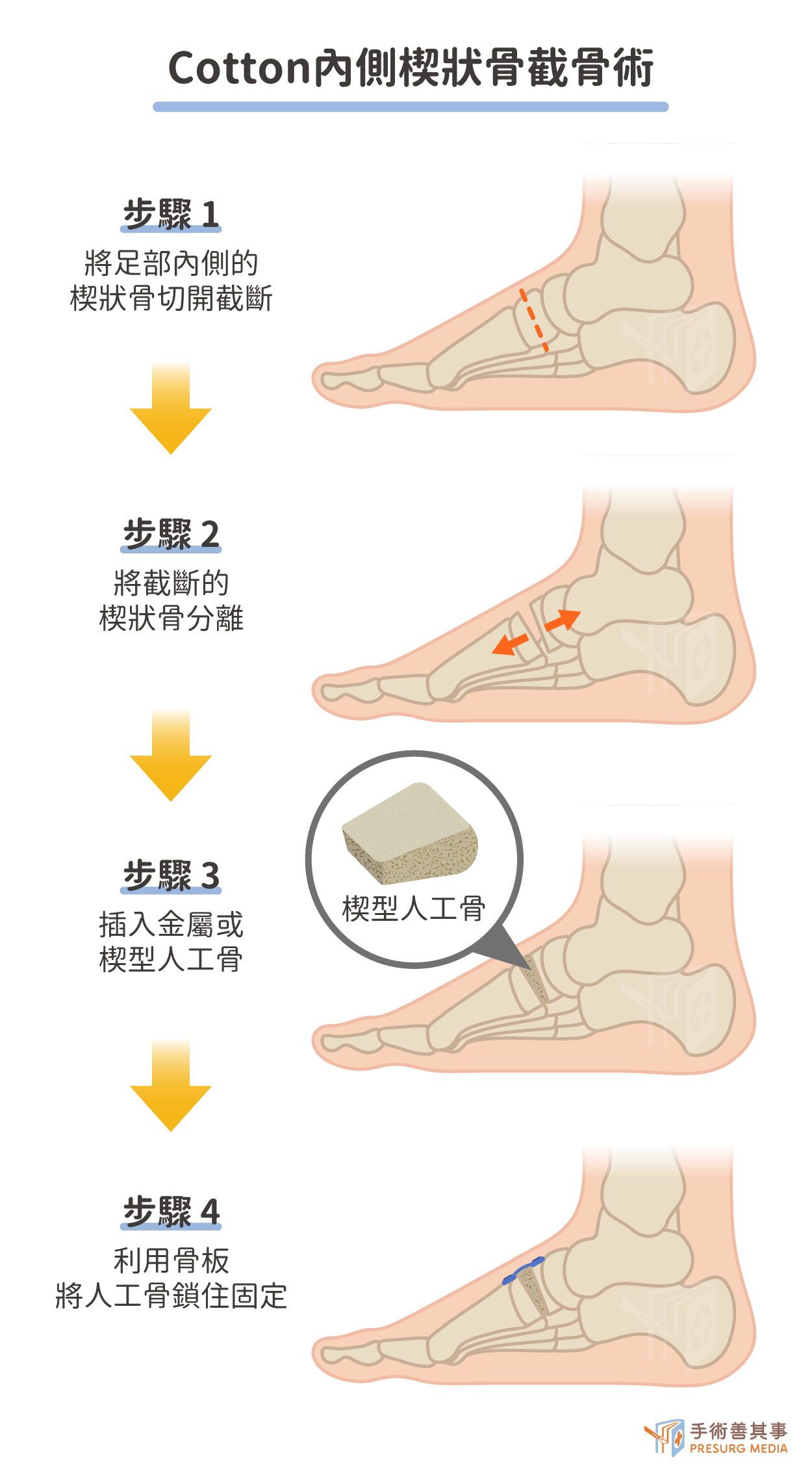 - Cotton 內側楔狀骨截骨術:此截骨術可有效的使內側柱蹠屈且增加其穩定性。