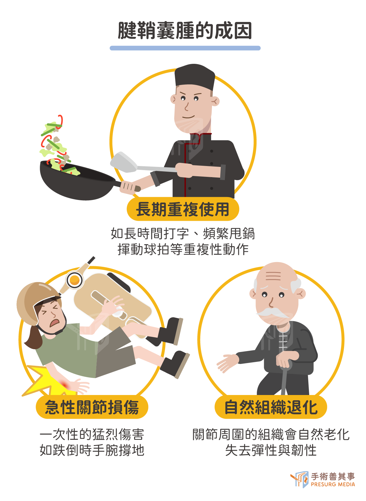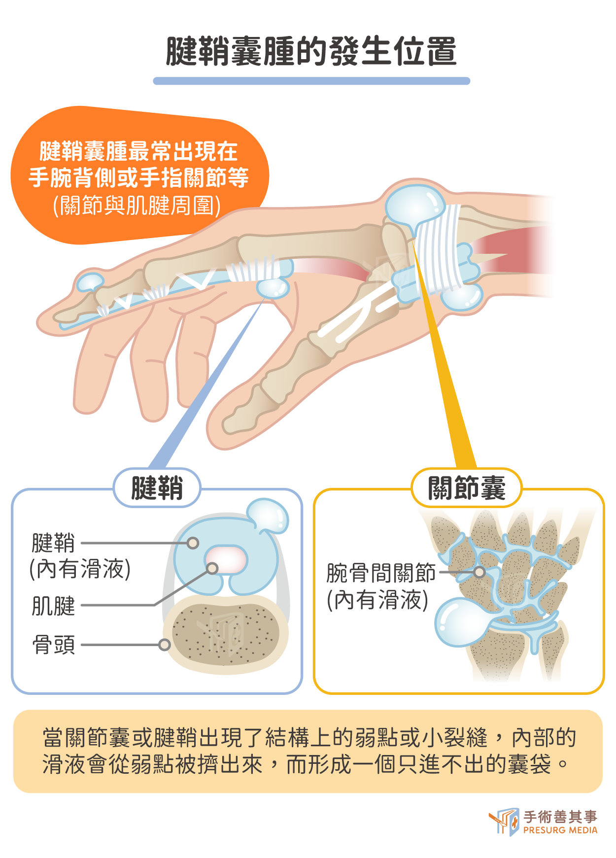 總結來說,無論是「慢慢磨損」還是「瞬間傷害」,腱鞘囊腫的根本原因都指向關節周邊組織的結構完整性受到了破壞。