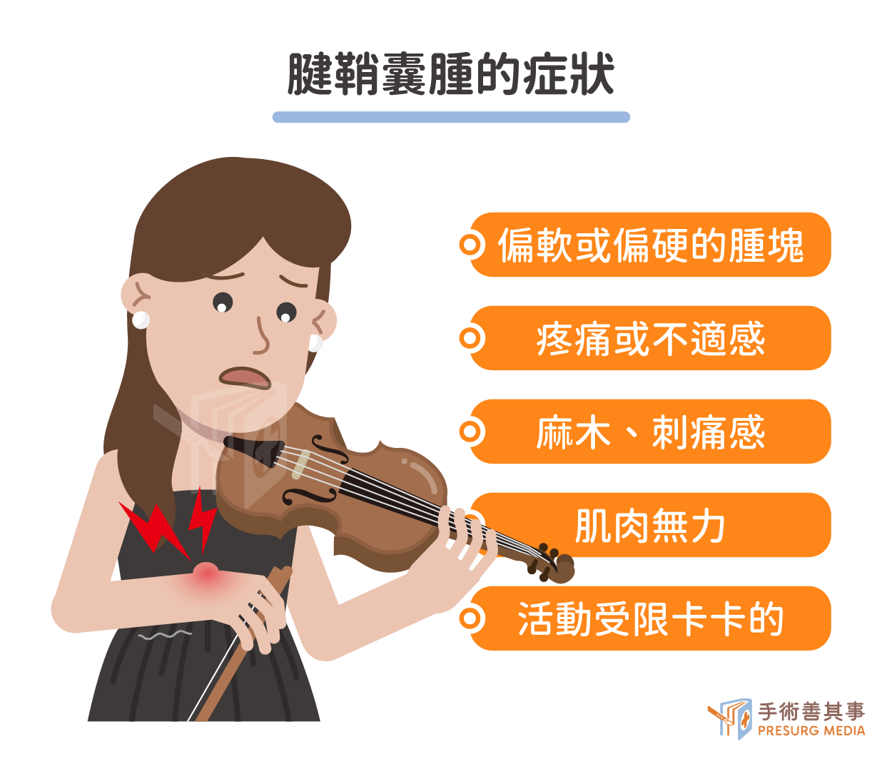 - 職業與生活習慣:需長時間、重複性使用手腕的族群,如電腦工作者、廚師、美髮師、音樂家(特別是弦樂器演奏者)、手工業者。