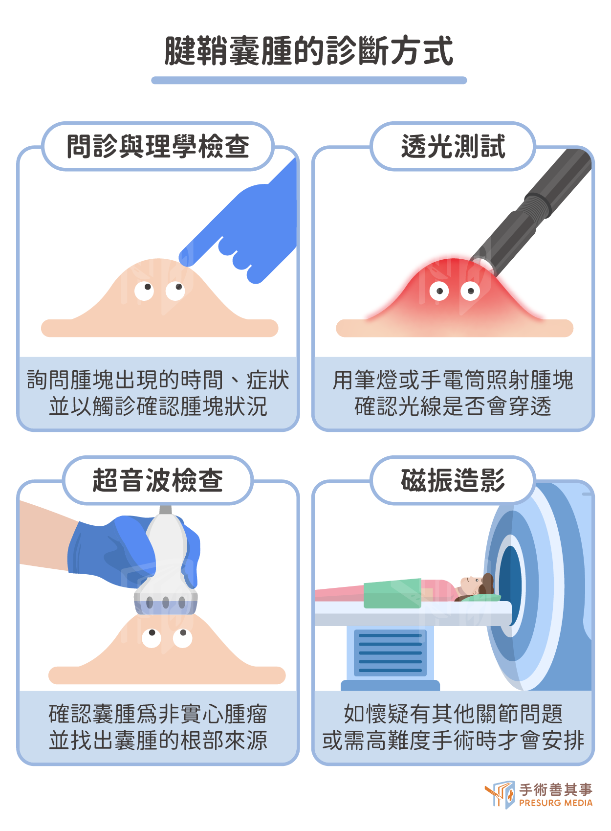 診斷腱鞘囊腫通常不複雜,醫師主要透過以下方式來確認:- 臨床問診與理學檢查:詢問腫塊出現的時間、症狀,並直接觸診腫塊的硬度、移動性及是否有壓痛感。