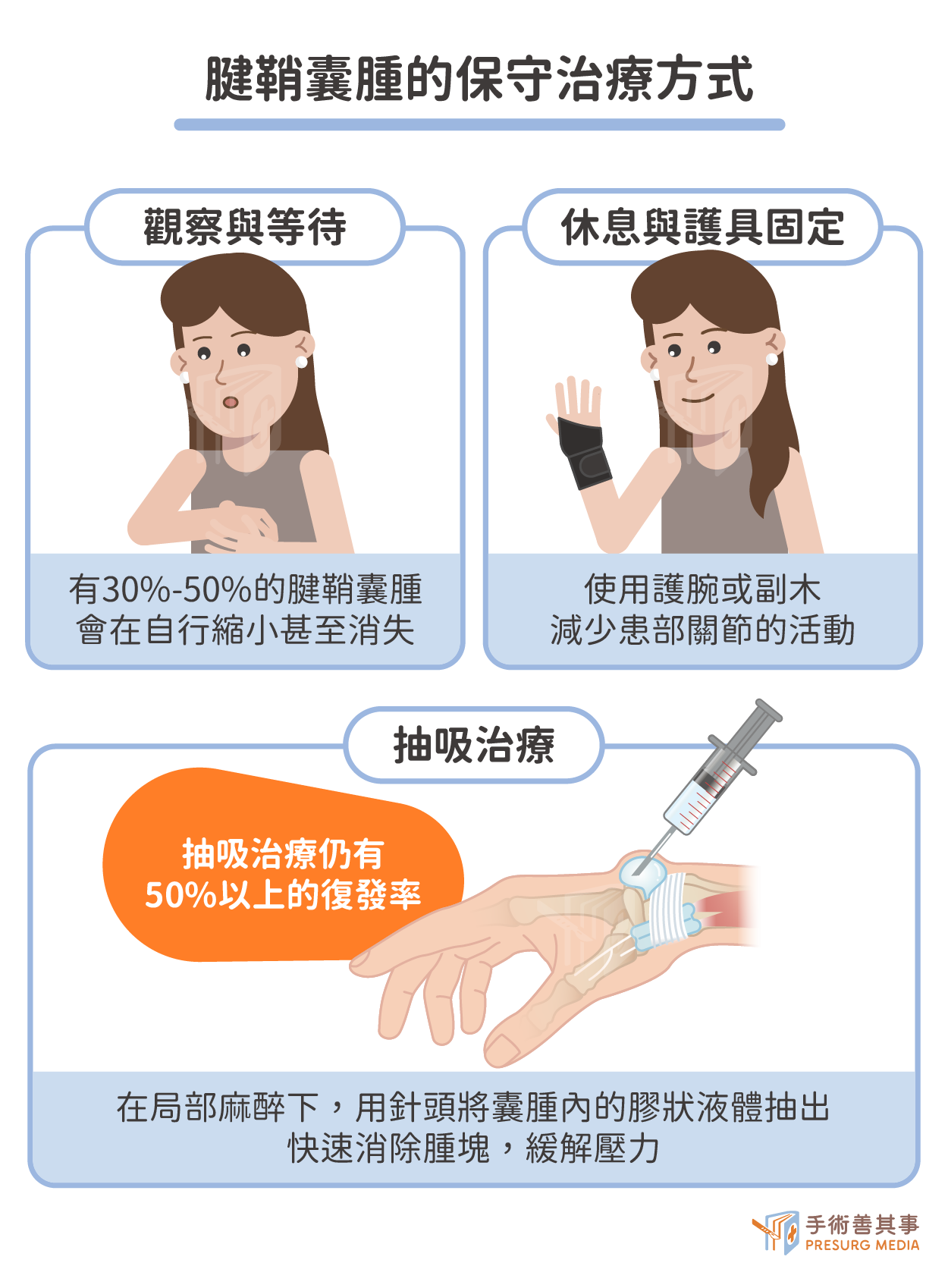 - 觀察與等待:約有30%至50%的腱鞘囊腫會在數月或數年內自行縮小甚至消失。這是最無侵入性的首選方式。
