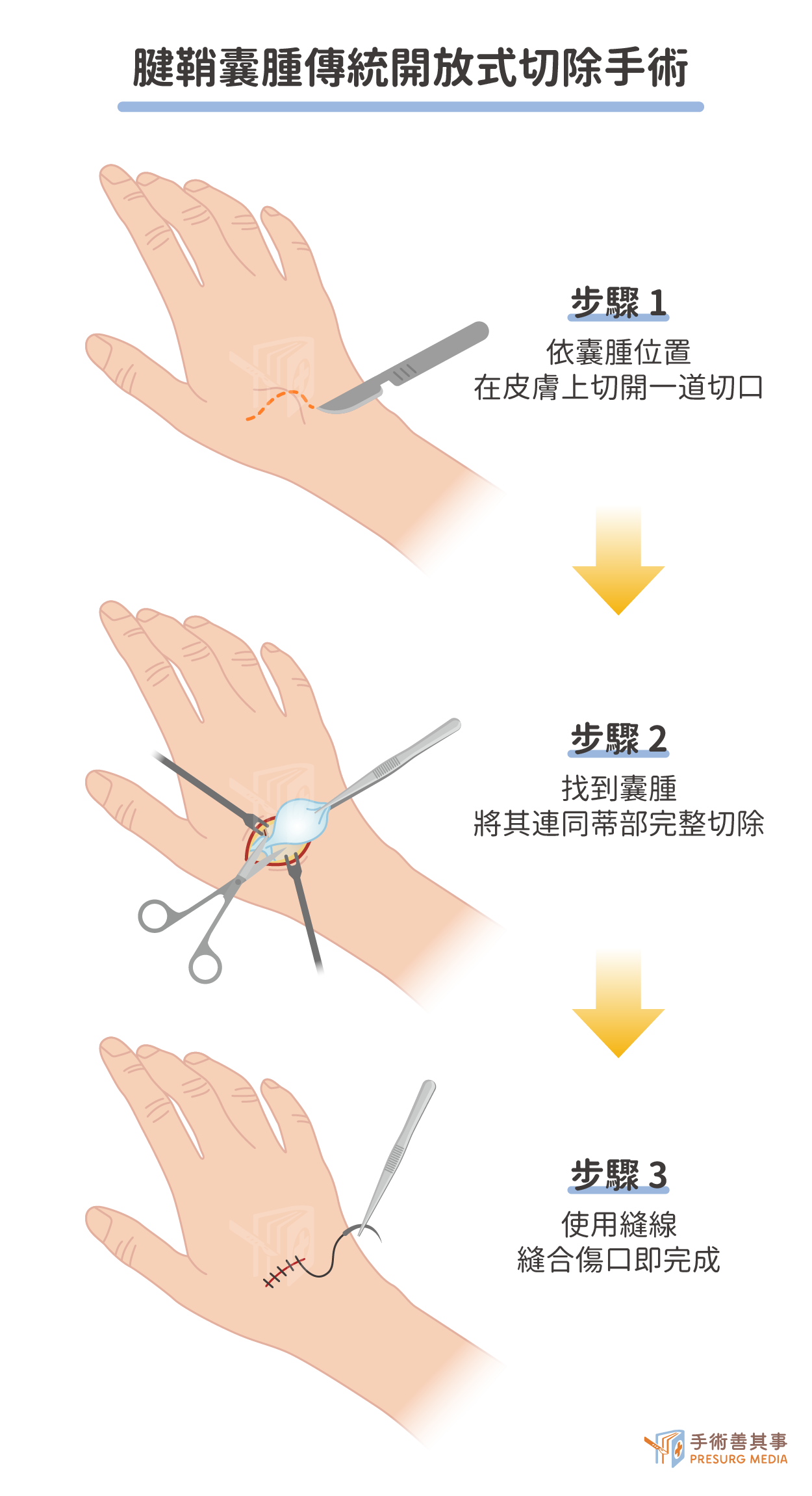| 手術方式 | 在囊腫正上方切開一個約 2-3 公分 的傷口,直接進行切除。 | 在手腕上開2-3個小於 0.5 公分的小孔,伸入鏡頭與器械操作。 |