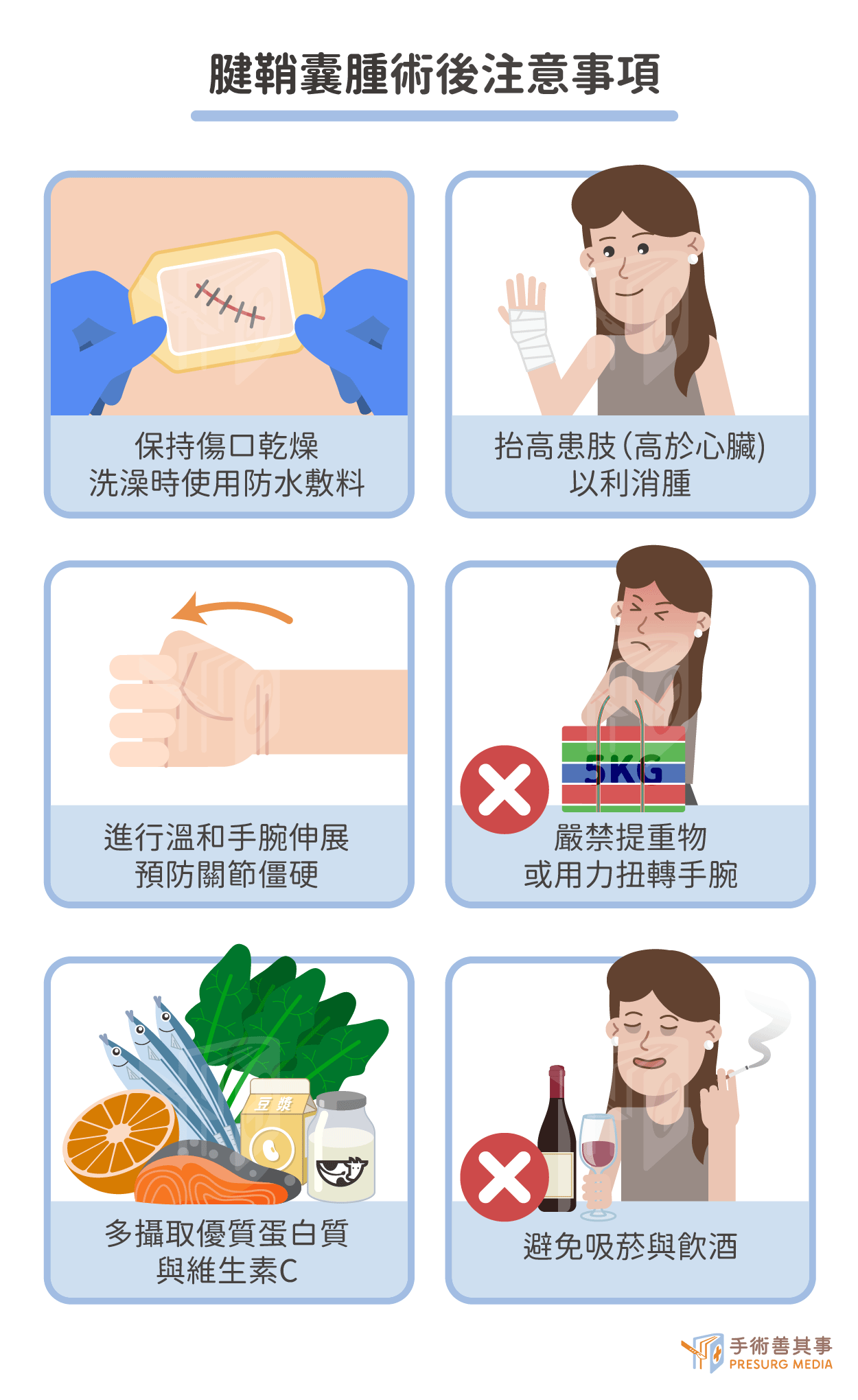 - 恢復期 (拆線後4-6週):依醫囑進行溫和手腕伸展,預防關節僵硬。嚴禁提重物或用力扭轉手腕。