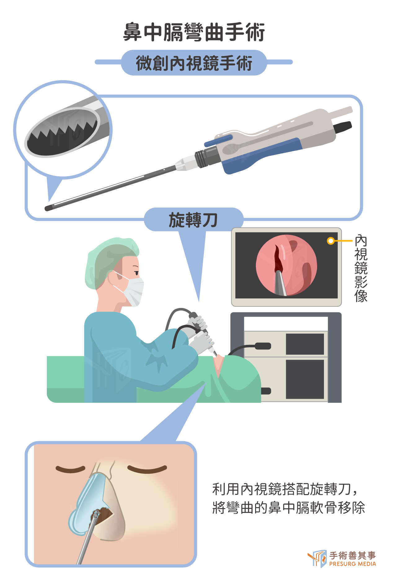 利用內視鏡搭配旋轉刀從鼻孔進入切開黏膜,透過清楚的影像呈現,將彎曲的鼻中膈軟骨移除,手術通常在局麻或全身麻醉下進行,大約需要1-2小時。內視鏡手術的優點為傷口小,術後腫脹、疼痛、出血的機會都少許多,恢復期很短,術後的止血棉球或紗布也會自行溶解,大幅減少病人的疼痛感。微創內視鏡手術的具體步驟如下: