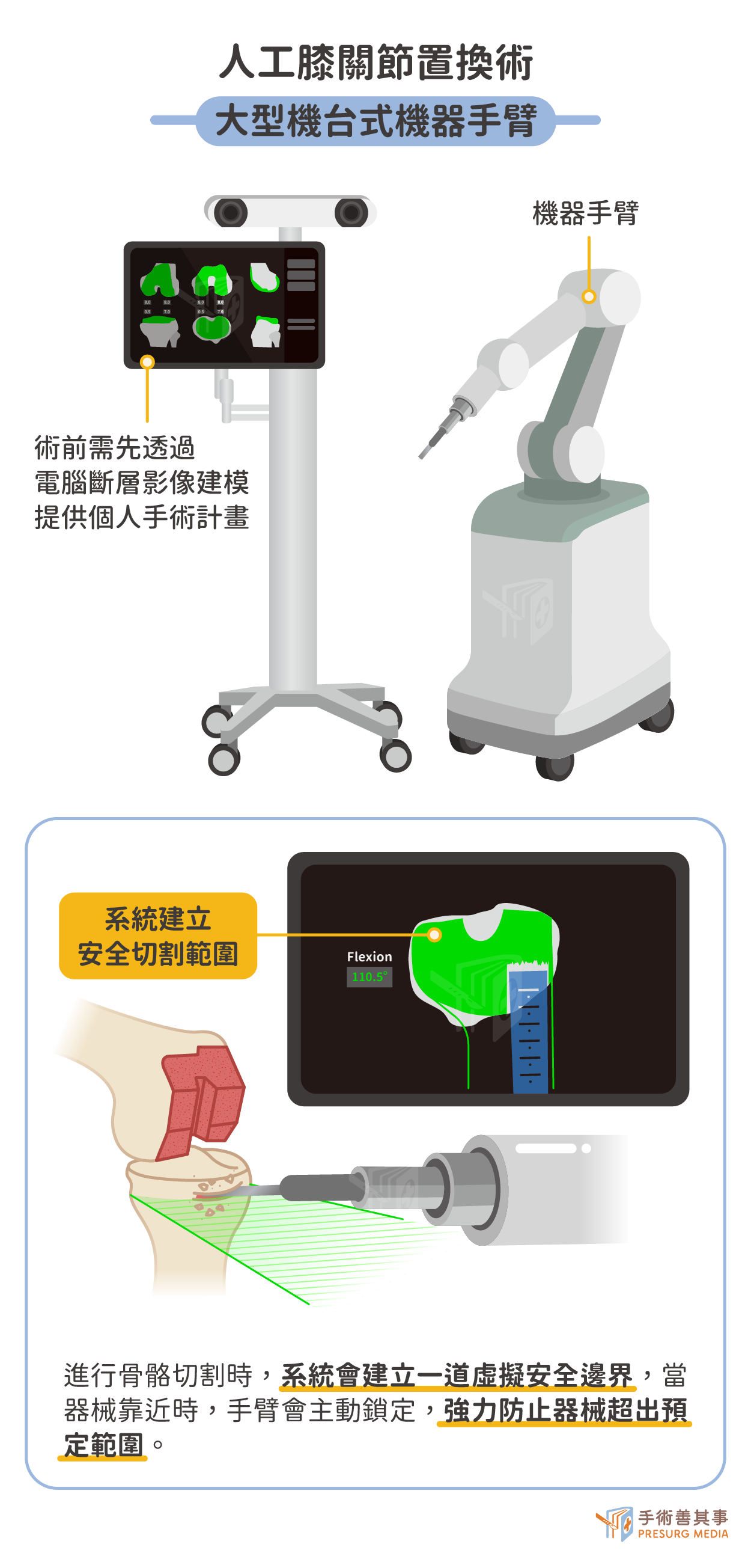 - 受限的手術靈活度: 大型機械手臂本體體積龐大,架設與校正耗時較長。雖然它能提供穩定的限制,但這種「重型機械」的介入,相較於手持式裝置的靈活,在處理某些特殊擺位,或應對突發的手術狀況時,即時的調整彈性相對較低。